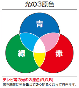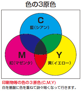 例えば、Y=黄とC=青をかけ合わせて緑をつくります。YとCの度合いを調整して、思い通りの緑にします。絵の具を混ぜ合わせるのと同じです。CMYを色の三原色といい、これらを同比率で混ぜ合わせると、黒になります。これを「減色混合の原理」といいます。