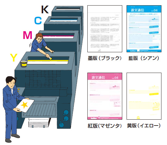 C版、M版、Y版、K 版を重ね合わせると、カラーになる仕組みです。