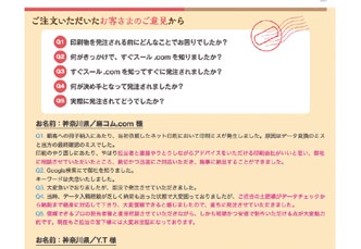 また、今まで頂いていたお客様の声(お客様アンケート)もトップページで紹介しています。今回のサイトリニューアルでもお客様の声を多々反映して仕様を決めました。これからも様々なお客様のお声を反映させ充実したサイト作りをしていきたいと考えています。