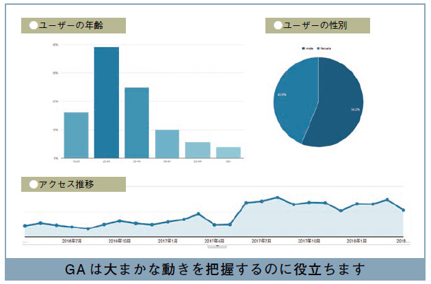 集客する為の技術的な施策も大事ですが、それと同等以上にアクセス解析が重要になってきます。アクセス解析なくしてWEB での成功は有り得ないと言っても過言ではありません。アクセス解析に関してはGA さえ導入していれば間違いないという風潮が長らくありましたが、近年では明らかにその風潮は変わってきています。GA では集客したユーザー達の大まかな動きを把握して、あくまで傾向を掴むというものでした。たとえば左図のように、ユーザーの年齢や性別、アクセス推移などが即時に把握できるものです。