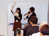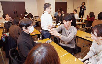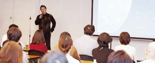 第一部は、「チームビルディング」をテーマにワークショップを行いました。今年は「スマイルコミュニケーションオフィス」代表の広瀬義浩氏を講師にお招きし、マシュマロチャレンジというゲームを使ってグループワークを体験しました。このマシュマロチャレンジは、チームビルディングを学ぶための有名なゲームのようで、限られた量のスパゲッティの乾麺、紐、テープ、マシュマロを使い、制限時間内にいかに高い塔をチームで建てられるかを競うというものですが、このゲームにはいくつかルールがあります。